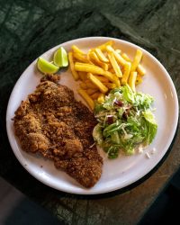 Milanesa de res o pollo clásica o gratinada con salsa y parmesano acompañada con papas fritas y ensalada cole slaw.