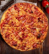 Pizza dulce y salada con tocineta, maíz y piña, sobre base de mozzarella y salsa.